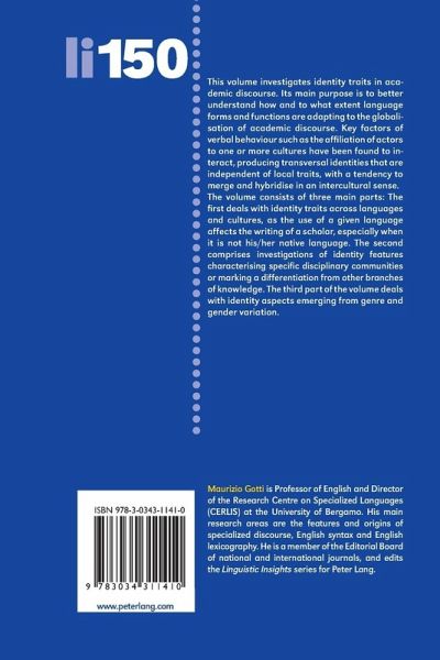 This volume investigates identity traits in academic discourse. Its main purpose is to better understand how and to what extent language forms and functions are adapting to the globalisation of academic discourse. Key factors of verbal behaviour such as the affiliation of actors to one or more cultures have been found to interact, producing transversal identities that are independent of local traits, with a tendency to merge and hybridise in an intercultural sense. The volume consists of three main parts: The first deals with identity traits across languages and cultures, as the use of a given language affects the writing of a scholar, especially when it is not his/her native language. The second comprises investigations of identity features characterising specific disciplinary communities or marking a differentiation from other branches of knowledge. The third part of the volume deals with identity aspects emerging from genre and gender variation.