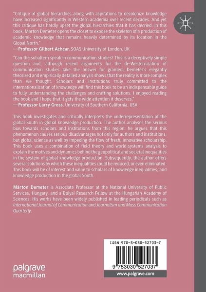 "Márton Demeter's monograph invokes rich anecdotal, empirical and scientometric evidence to delineate the contours of a world system that preserves thedominance of Western knowledge and scholars and the westernisation or peripheralisation of the rest - a system defined by geopolitical and material inequalities, socio-economic class differences, institutional elitism and publishing biases. Demeter's work counters narratives that present academia as meritocratic and that justify disparities in world publications on the basis of pure rigour, exposing rather norms and values that perpetuate a western elitist system and peripheralise those who happen to lack this cultural capital. Demeter's work adds to an expanding field of research documenting how Anglophone standards and biases in journal indexing, peer review and editorial board recruitment marginalise consistently the Global South. His practical and concrete suggestions to subvert this system of horizontal and vertical inequalities could not be timelier and provides momentum to decolonisation movements in higher education across the world."