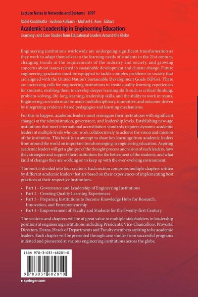 For this to happen, academic leaders must reimagine their institutions with significant changes at the administration, governance, and leadership levels. Establishing new-age institutions that meet international accreditation standards requires dynamic academic leaders at multiple levels who can work collaboratively to achieve the vision and mission of the institution. This book is an attempt to share key learnings from academic leaders from around the world on important trends emerging in engineering education. Aspiring academic leaders will get a glimpse of the thought process and vision of such leaders, how they strategize and support their institutions for the betterment of the students, and what kind of changes they are working on to keep up with the ever-evolving environment.