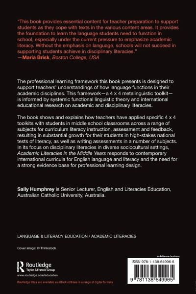 The professional learning framework this book presents is designed to support teachers' understandings of how language functions in their academic disciplines. This framework-a 4 x 4 metalinguistic toolkit-is informed by systemic functional linguistic theory and international educational research on academic and disciplinary literacies. The book shows and explains how teachers have applied specific 4 x 4 toolkits with students in middle school classrooms across a range of subjects for curriculum literacy instruction, assessment and feedback, resulting in substantial growth for their students in high-stakes national tests of literacy, as well as writing assessments in a number of subjects. In its focus on disciplinary literacies in diverse sociocultural settings, Academic Literacies in the Middle Years responds to contemporary international curricula for English language and literacy and the need for a strong evidence base for professional learning design.