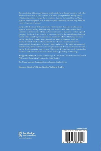 The descriptions Chinese and Japanese people attribute to themselves and to each other differ vastly and stand in stark contrast to Western perceptions that usually identify a 'similar disposition' between the two nations. Academic Nationals in China and Japan explores human categories, how academics classify themselves and how they divide the world into groups of people. Margaret Sleeboom carefully analyses the role the nation-state plays in Chinese and Japanese academic theory, demonstrating how nation-centric blinkers often force academics to define social, cultural and economic issues as unique to a certain regional grouping. The book shows how this in turn contributes to the consolidating of national identity while identifying the complex and unintended effects of historical processes and the role played by other local, personal and universal identities which are usually discarded. While this book primarily reveals how academic nations are conceptualized through views of nature, culture and science, the author simultaneously identifies comparable problems concerning the relation between social science research and the development of the nation state. This book will appeal not only to Asianists but also to those with research interests in Cultural Studies and Sinology.