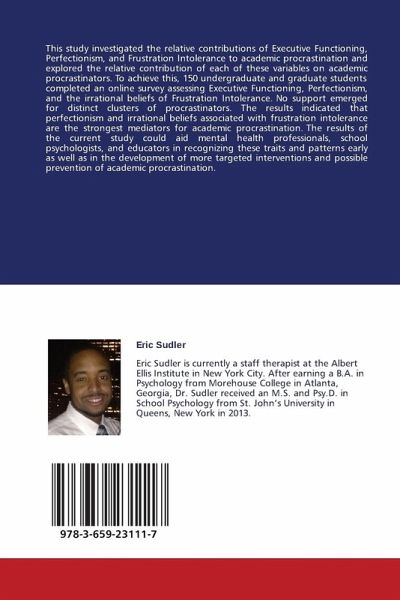 This study investigated the relative contributions of Executive Functioning, Perfectionism, and Frustration Intolerance to academic procrastination and explored the relative contribution of each of these variables on academic procrastinators. To achieve this, 150 undergraduate and graduate students completed an online survey assessing Executive Functioning, Perfectionism, and the irrational beliefs of Frustration Intolerance. No support emerged for distinct clusters of procrastinators. The results indicated that perfectionism and irrational beliefs associated with frustration intolerance are the strongest mediators for academic procrastination. The results of the current study could aid mental health professionals, school psychologists, and educators in recognizing these traits and patterns early as well as in the development of more targeted interventions and possible prevention of academic procrastination.