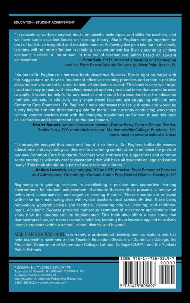 Beginning with guiding teachers in establishing a positive and supportive learning environment for student achievement, Academic Success then presents a review of behavioral, constructivist, and cognitive learning theories. These theories are reflected within the four main categories with which teachers must constantly deal, these being motivation; goals/objectives and feedback; delivering original learning; and reinforcement.