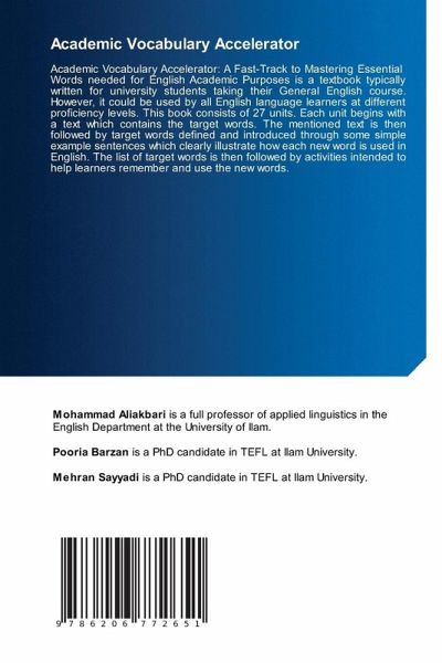 Academic Vocabulary Accelerator: A Fast-Track to Mastering Essential Words needed for English Academic Purposes is a textbook typically written for university students taking their General English course. However, it could be used by all English language learners at different proficiency levels. This book consists of 27 units. Each unit begins with a text which contains the target words. The mentioned text is then followed by target words defined and introduced through some simple example sentences which clearly illustrate how each new word is used in English. The list of target words is then followed by activities intended to help learners remember and use the new words.
