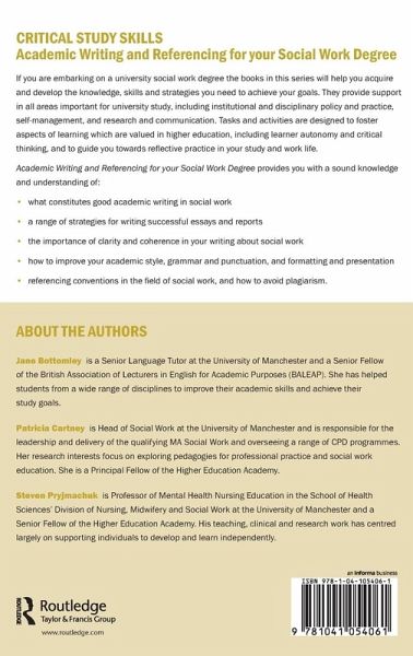 Pat Cartney is Head of Social Work in the School of Health Sciences Division of Nursing, Midwifery and Social Work at the University of Manchester. She is a Principal Fellow of the Higher Education Academy. Her teaching and research interests focus on exploring how people learn best about professional practice and how they become knowledgeable and skilled social work practitioners. Jane Bottomley is a Senior Language Tutor at the University of Manchester and a Senior Fellow of the British Association of Lecturers in English for Academic Purposes (BALEAP).She has been involved in the development of a number of content-based academic study skills courses at the University of Manchester and has published widely in this field. Steven Pryjmachuk is Professor of Mental Health Nursing Education in the School of Health Science's Division of Nursing, Midwifery and Social Work at the University of Manchester and a Senior Fellow of the Higher Education Academy. His teaching, clinical and research work has centred largely on supporting and facilitating individuals - be they students, patients or colleagues - to develop, learn or care independently. In December 2014, Steven was elected as vice Chair (2015-16) and Chair (2017-18) of Mental Health Nurse Academics UK, an organisation representing 65 Higher Education Institutions providing education and research on mental health nursing.