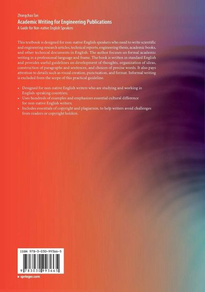 This textbook is designed for non-native English speakers who need to write scientific and engineering research articles, technical reports, engineering thesis, academic books, and other technical documents in English. The author focuses on formal academic writing in a professional language and frame. The book is written in standard English and provides useful guidelines on development of thoughts, organization of ideas, construction of paragraphs and sentences, and choices of precise words. It also pays attention to details such as visual creation, punctuation, and format. Informal writing is excluded from the scope of this practical guideline.