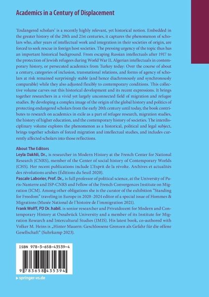 'Endangered scholars' is a recently highly relevant, yet historical notion. Embedded in the greater history of the 20th and 21st centuries, it captures the phenomenon of scholars who, after years of intellectual work and integration in their societies of origin, are forced to seek rescue in foreign host societies. The pressing urgency of the topic thus has an important historical background. From escaping Russian intellectuals after 1917 to the protection of Jewish refugees during World War II, Algerian intellectuals in contemporary history, or persecuted academics from Turkey today: Over the course of about a century, categories of inclusion, transnational relations, and forms of agency of scholars at risk remained surprisingly stable (and hence diachronously and synchronously comparable) while they also adjusted flexibly to contemporary conditions. This collective volume carves out this historical development and its recent expressions. It brings together researchers in a vivid yet largely unconnected field of migration and refugee studies. By developing a complex image of the origin of the global history and politics of protecting endangered scholars from the early 20th century until today, the book contributes to research on academics in exile as a part of refugee research, migration studies, the history of higher education, and the contemporary history of societies. The interdisciplinary volume explores the phenomenon as a historical, political and legal subject, brings together scholars of forced migration and intellectual studies, and includes currently affected scholars into those reflections.