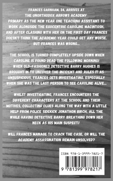 'No, don't be ridiculous! This kind of thing doesn't happen in a school" Frances Garnham, 24, arrives at the unorthodox Arrows Academy Primary as the new year one teaching assistant to work alongside the egocentric Caroline Macintosh, and after clashing with her on the first day Frances doesn't think the year could get any worse. But Frances was wrong... The school is turned completely upside down when Caroline is found dead the following morning! When old-fashioned Detective Barry Hughes is brought in to uncover the incident and rules it as unsuspicious, Frances gets investigating. Especially when she was the last person to see Caroline alive... Whilst investigating, Frances encounters the different characters at the school and their motives, collecting clues along the way with a little help from police side kick Jonathan Birch, all the while having Detective Barry breathing down her neck as his main suspect! Will Frances manage to crack the case, or will the academy assassination remain unsolved?