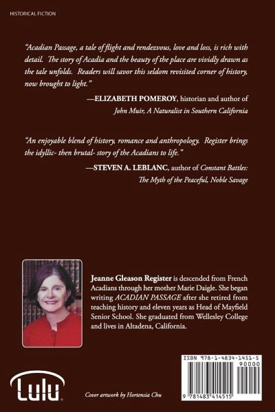 "Acadian Passage, a tale of flight and rendezvous, love and loss, is rich with detail. The story of Acadia and the beauty of the place are vividly drawn as the tale unfolds. Readers will savor this seldom revisited corner of history, now brought to light." -Elizabeth Pomeroy, historian and author of John Muir, A Naturalist in Southern California "An enjoyable blend of history, romance and anthropology. Register brings the idyllic- then brutal- story of the Acadians to life." -Steven A. LeBlanc, author of Constant Battles: The Myth of the Peaceful, Noble Savage Jeanne Gleason Register is descended from French Acadians through her mother Marie Daigle. She began writing ACADIAN PASSAGE after she retired from teaching history and eleven years as Head of Mayfield Senior School. She graduated from Wellesley College and lives in Altadena, California.