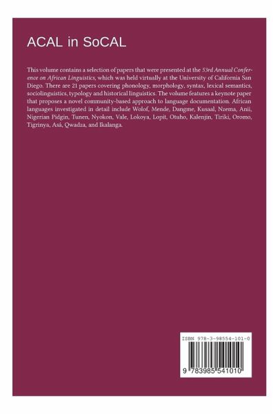 This volume contains a selection of papers that were presented at the 53rd Annual Conference on African Linguistics, which was held virtually at the University of California San Diego. There are 21 papers covering phonology, morphology, syntax, lexical semantics, sociolinguistics, typology and historical linguistics. The volume features a keynote paper that proposes a novel community-based approach to language documentation. African languages investigated in detail include Wolof, Mende, Dangme, Kusaal, Nzema, Anii, Nigerian Pidgin, Tunen, Nyokon, Vale, Lokoya, Lopit, Otuho, Kalenjin, Tiriki, Oromo, Tigrinya, Asä, Qwadza, and Ikalanga.