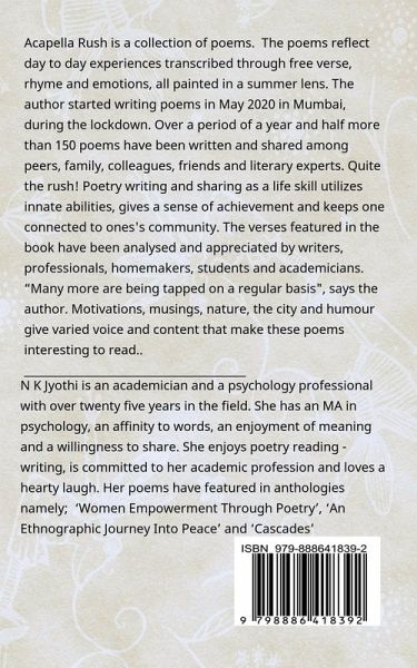 Acapella Rush is a collection of poems. It is evocative and you may start writing poems as you explore this book.The poems reflect day to day experiences transcribed through free verse, rhyme and emotions, all painted in a summer lens. The author started writing poems in May 2020 in Mumbai, during the lockdown. Over a period of a year and half more than 150 poems have been written and shared among peers, family, colleagues, friends and literary experts. Quite the rush! Poetry writing and sharing as a life skill utilizes innate abilities, gives a sense of achievement and keeps one connected to ones's community. The verses featured in the book have been analysed and appreciated by writers, professionals, homemakers, students and academicians. "Many more are being tapped on a regular basis", says the author. Motivations, musings, nature, the city and humour give varied voice and content that make these poems interesting to read.