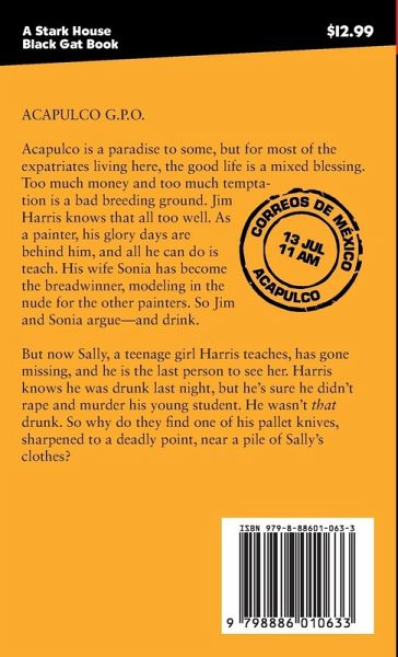 ACAPULCO G.P.O. Acapulco is a paradise to some, but for most of the expatriates living here, the good life is a mixed blessing. Too much money and too much temptation is a bad breeding ground. Jim Harris knows that all too well. As a painter, his glory days are behind him, and all he can do is teach. His wife Sonia has become the breadwinner, modeling in the nude for the other painters. So Jim and Sonia argue-and drink. But now Sally, a teenage girl Harris teaches, has gone missing, and he is the last person to see her. Harris knows he was drunk last night, but he's sure he didn't rape and murder his young student. He wasn't that drunk. So why do they find one of his pallet knives, sharpened to a deadly point, near a pile of Sally's clothes?