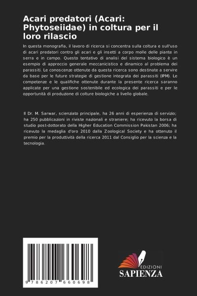 In questa monografia, il lavoro di ricerca si concentra sulla coltura e sull'uso di acari predatori contro gli acari e gli insetti a corpo molle delle piante in serra e in campo. Questo tentativo di analisi del sistema biologico è un esempio di approccio generale meccanicistico e dinamico al problema dei parassiti. Le conoscenze ottenute da questa ricerca sono destinate a servire da base per le future strategie di gestione integrata dei parassiti (IPM). Le competenze e le qualifiche ottenute durante la presente ricerca saranno applicate per una gestione sostenibile ed ecologica dei parassiti e per le opportunità di produzione di colture biologiche a livello globale.