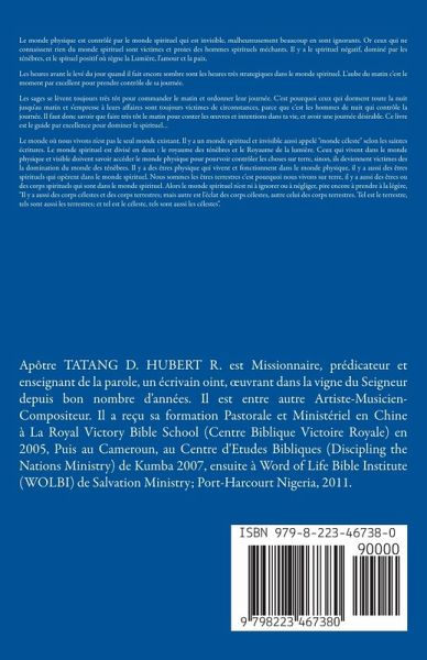 Le monde physique est contrôlé par le monde spirituel qui est invisible, malheureusement beaucoup en sont ignorants. Or ceux qui ne connaissent rien du monde spirituel sont victimes et proies des hommes spirituels méchants. Il y a le spirituel négatif, dominé par les ténèbres, et le spituel positif où règne la Lumière, l'amour et la paix. Les heures avant le levé du jour quand il fait encore sombre sont les heures très strategiques dans le monde spirituel. L'aube du matin c'est le moment par excellent pour prendre contrôle de sa journée. Les sages se lèvent toujours très tôt pour commander le matin et ordonner leur journée. C'est pourquoi ceux qui dorment toute la nuit jusqu'au matin et s'empresse à leurs affaires sont toujours victimes de circonstances, parce que c'est les hommes de nuit qui contrôle la journée. Il faut donc savoir que faire très tôt le matin pour conter les ¿uvres et intentions dans ta vie, et avoir une journée désirable. Ce livre est le guide par excellence pour dominer le spirituel... Le monde où nous vivons n'est pas le seul monde existant. Il y a un monde spirituel et invisible aussi appelé "monde céleste" selon les saintes écritures. Le monde spirituel est divisé en deux : le royaume des ténèbres et le Royaume de la lumière. Ceux qui vivent dans le monde physique et visible doivent savoir accéder le monde physique pour pourvoir contrôler les choses sur terre, sinon, ils deviennent victimes des la domination du monde des ténèbres. Il y a des êtres physique qui vivent et fonctionnent dans le monde physique, il y a aussi des êtres spirituels qui opèrent dans le monde spirituel. Nous sommes les êtres terrestres c'est pourquoi nous vivons sur terre, il y a aussi des êtres ou des corps spirituels qui sont dans le monde spirituel. Alors le monde spirituel n'est ni à ignorer ou à négliger, pire encore à prendre à la légère, "Il y a aussi des corps célestes et des corps terrestres; mais autre est l'éclat des corps célestes, autre celui des corps terrestres. Tel est le terrestre, tels sont aussi les terrestres; et tel est le céleste, tels sont aussi les célestes".