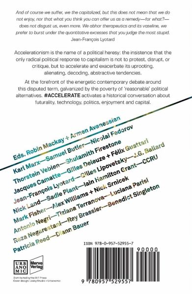 An apparently contradictory yet radically urgent collection of texts tracing the genealogy of a controversial current in contemporary philosophy. Accelerationism is the name of a contemporary political heresy: the insistence that the only radical political response to capitalism is not to protest, disrupt, critique, or détourne it, but to accelerate and exacerbate its uprooting, alienating, decoding, abstractive tendencies. #Accelerate presents a genealogy of accelerationism, tracking the impulse through 90s UK darkside cyberculture and the theory-fictions of Nick Land, Sadie Plant, Iain Grant, and CCRU, across the cultural underground of the 80s (rave, acid house, SF cinema) and back to its sources in delirious post-68 ferment, in texts whose searing nihilistic jouissance would later be disavowed by their authors and the marxist and academic establishment alike. On either side of this central sequence, the book includes texts by Marx that call attention to his own "Prometheanism,” and key works from recent years document the recent extraordinary emergence of new accelerationisms steeled against the onslaughts of neoliberal capitalist realism, and retooled for the twenty-first century. At the forefront of the energetic contemporary debate around this disputed, problematic term, #Accelerate activates a historical conversation about futurality, technology, politics, enjoyment, and capital. This is a legacy shot through with contradictions, yet urgently galvanized today by the poverty of "reasonable” contemporary political alternatives.