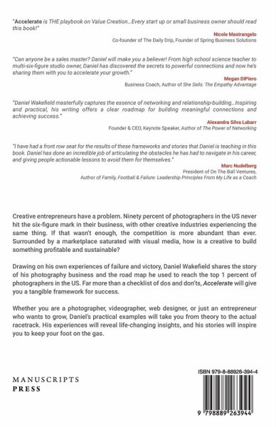 From Side Hustle to Six Figures-Fast. Discover the Proven Framework That Helped One Photographer Accelerate His Creative Business to Top-Tier Success. Creative entrepreneurs are in crisis. More than 90% of photographers in the U.S. never break the six-figure barrier. Other creatives-from videographers and designers to copywriters and solopreneurs-face the same uphill battle. The market is saturated, attention is scarce, and traditional business advice falls flat in creative industries. Accelerate is the roadmap Daniel Wakefield wished he had when launching his business. In just twelve months, Daniel transformed his creative passion into a multi-six- figure business-without a business degree, a big budget, or a long list of contacts. A former high school science teacher turned founder of Top-Tier Headshots, Daniel went from photographing wildlife to building a premium headshot brand sought after by executives, keynote speakers, and high-end professionals across the country. Now he¿s breaking down every step of that journey so you can do the same. This isn't just another motivational business book filled with buzzwords and broad advice. Accelerate is a tactical guide designed specifically for photographers, creatives, and solo entrepreneurs ready to attract premium clients, raise their prices with confidence, and build a thriving, sustainable business doing what they love. In this book, yoüll learn how to:Identify and attract high-value clients in your niche Build authentic, scalable connections that drive revenue Create a premium-priced offer that clients rave about Use Daniel¿s signature Hype Tornado to generate buzz and repeat business Stop discounting your work and start selling based on real value Shift your mindset from "technician¿ to "business owner¿ Craft a client experience that turns customers into brand evangelists Whether you're a photographer, videographer, designer, or creative freelancer, Accelerate will equip you with a repeatable system for turning passion into profit. Grab your copy today and start building the creative business you were meant for.