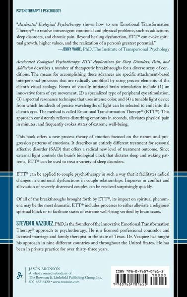 By means of drastically amplifying the effect of interpersonal dialog through the use of precise elements of client visual ecology, non-pharmaceutical breakthroughs for a variety of conditions have been achieved. These conditions include seasonal affective disorder (SAD), chronic physical pain, substance addictions, sex addictions, a variety of sleep disorders, and couple relationship dysfunction. Accelerated Ecological Psychotherapy describes treatment of these conditions using ETT®, and presents stunning advances in the facilitation of states of wellbeing.