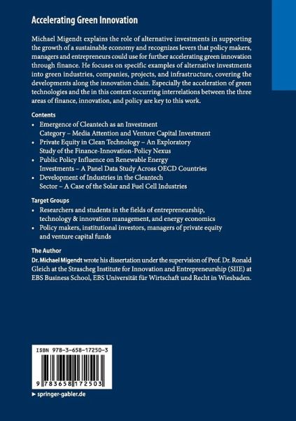 Michael Migendt explains the role of alternative investments in supporting the growth of a sustainable economy and recognizes levers that policy makers, managers and entrepreneurs could use for further accelerating green innovation through finance. He focuses on specific examples of alternative investments into green industries, companies, projects, and infrastructure, covering the developments along the innovation chain. Especially the acceleration of green technologies and the in this context occurring interrelations between the three areas of finance, innovation, and policy are key to this work.