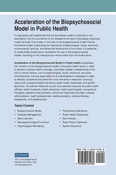 It is generally well-established that the biomedical model is informed on the assumption that the occurrence of the disease is the result of biological molecules inside the body. This is seen in the view of the biopsychosocial model that the biomedical model is excluding the importance of psychological, social, economic, environmental, spiritual, and behavioral dimensions of the illness. It is essential to create better awareness to accelerate the use of the biopsychosocial model-focusing on the individual as a whole rather than the illness alone. Acceleration of the Biopsychosocial Model in Public Health accelerates the inclusion of the biopsychosocial model in the public health sector in order to achieve universal health coverage. It provides a better understanding of the role of various factors, such as psychological, social, emotional, economic, and behavioral, that are responsible for the development of diseases in order to develop comprehensive prevention and intervention measures. Covering topics such as psychological well-being, public health awareness, and system dynamics, this premier reference source is an excellent resource for public health officials, health therapists, health educators, health psychologists, occupational therapists, palliative care providers, community healthcare providers, hospital administrators, health professionals, medical students, medical libraries, researchers, and academicians.