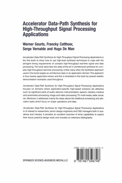 Accelerator Data-Path Synthesis for High-Throughput Signal Processing Applications focuses on domains where application-specific high-speed solutions are attractive such as significant parts of audio, telecom, instrumentation, speech, robotics, medical and automotive processing, image and video processing, TV, multi-media, radar, sonar, etc. Moreover, it addresses mainly the steps above the traditional scheduling and allocation tasks which focus on scalar operations and data.