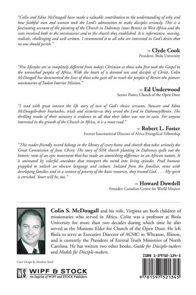 Colin and Edna McDougall have made a valuable contribution to the understanding of why and how faithful men and women took the Lord's admonition to make disciples seriously. This is a fascinating account of the planting of the Church in Dahomey (now Benin) in West Africa and the costs involved both to the missionaries and to the church they established. It is informative, moving, realistic, challenging and well written. I recommend it to all who are interested in God's desire that no one should perish. Clyde Cook, President, Biola University. Few lifestyles are so completely different from today's Christian as those who first took the Gospel to the unreached peoples of Africa. With the heart of a devoted son and disciple of Christ, Colin McDougall has documented the lives of those who gave all to reach the peoples of Benin-the pioneer missionaries of Sudan Interior Mission. Ed Underwood, Senior Pastor, Church of the Open Door. I read with great interest the life story of two of God's choice servants, Stewart and Edna McDougall-their heartaches, trials and victories-as they served the Lord in Dahomey/Benin. The thrilling results of their ministry is evidence to all that their labor was not in vain. For anyone interested in the growth of the Church in Africa, it is a must read. Robert L. Foster, former International Director of Africa Evangelical Fellowship. This reader-friendly record belongs in the library of every home and church that takes seriously the Great Commission of Jesus Christ. The story of SIM church planting in Dahomey spells out the historic roots of an epic movement that has made an astonishing difference in an African nation. It is animated by colorful anecdotes that transport the mind into living episodes. Frail humans grappled to unlock an obscure language and culture. Isolated from the familiar, some with developing families and in a context of poverty of the basic resources, they trusted God. . . . My spirit is enriched. Yours will be, too. Howard Dowdell, Founder: Canadian Centre for World Mission.