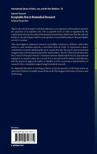 This book is the first major work that addresses a core question in biomedical research: the question of acceptable risk. The acceptable level of risks is regulated by the requirement of proportionality in biomedical research law, which state that the risk and burden to the participant must be in proportion to potential benefits to the participant, society or science.