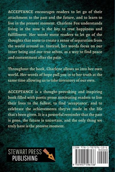 ACCEPTANCE encourages readers to let go of their attachment to the past and the future, and to learn to live in the present moment. Charlene Fox understands living in the now is the key to true happiness and fulfillment. Her words move readers to let go of the thoughts that seem to create a sense of separation from the world around us. Instead, her words focus on our inner being and our true selves, as a way to find peace and contentment after the pain. Throughout the book, Charlene allows us into her own world. Her words of hope pull you into her truth at the same time allowing us to take inventory of our own. ACCEPTANCE is a thought-provoking and inspiring book filled with poetic prose motivating readers to live their lives to the fullest, to find 'acceptance', and to celebrate the achievements they've made in the life that's been given. It is a powerful reminder that the past is gone, the future is uncertain, and the only thing we truly have is the present moment.