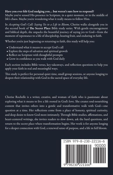 Have you ever felt God nudging you... but weren't sure how to respond? Maybe you've sensed His presence in Scripture, in a quiet moment, or in the middle of life's chaos. Maybe you're wondering what it really means to follow Him. In Accepting God's Call: Saying Yes to a Life in Bloom, Cherise walks alongside you in the second book of The Secret Place Bible study series. With gentle encouragement and biblical depth, she unpacks the beautiful journey of saying yes to God-from the moment of repentance to a life of discipleship, bearing fruit, and enduring in faith. Whether you're just beginning or returning to faith, this study will help you:Understand what it means to accept God's call Explore the steps of salvation and spiritual growth Reflect on Scripture with thoughtful prompts Grow in confidence as you walk with God daily Each section includes Bible verses, key takeaways, and reflection questions to help you apply your faith in real and meaningful ways. This study is perfect for personal quiet time, small group sessions, or anyone longing to deepen their relationship with God in the sacred space of everyday life.