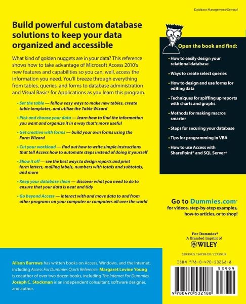 Includes nine minibooks that cover such topics as database design, tables, queries, forms, reports, macros, database administration, securing data, programming with Visual Basic for Applications (VBA), and using Access with the Web