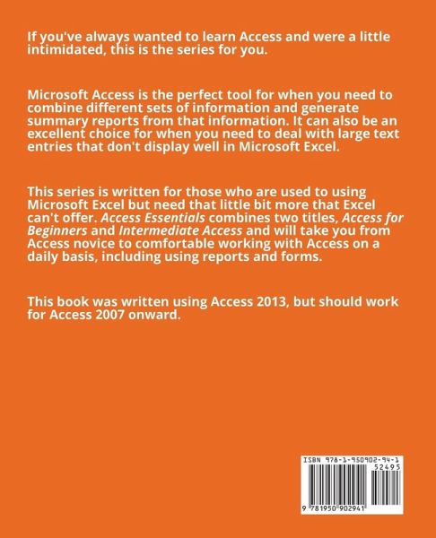 If you've always wanted to learn Access and were a little intimidated, this is the series for you. Microsoft Access is the perfect tool for when you need to combine different sets of information and generate summary reports from that information. It can also be an excellent choice for when you need to deal with large text entries that don't display well in Microsoft Excel. This series is written for those who are used to using Microsoft Excel but need that little bit more that Excel can't offer. Access Essentials combines two titles, Access for Beginners and Intermediate Access and will take you from Access novice to comfortable working with Access on a daily basis, including using reports and forms. This book was written using Access 2013, but should work for Access 2007 onward.