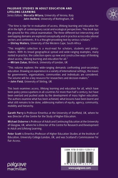 This book examines access, lifelong learning and education for all, which have been policy preoccupations in all countries for more than half a century, but have been overlaid and pushed aside by the development of mass higher education. The authors examine what has been achieved, what lessons have been learnt and what still remains to be done, addressing matters of equity, agency, community, mobility and hierarchy.