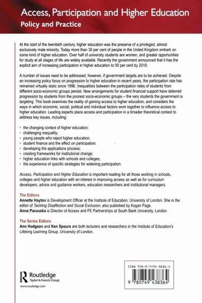 Participation - and particularly widening participation to students from less-privileged social groups and those who have traditionally not entered HE - has been a major issue since at least the early 1950s. Widening participation has been an active policy of almost all UK governments over the past 40 years, but the issue is now reaching a possible impasse, with numbers at best static and key groups still effectively excluded from higher education. This is a major political issue as well as one of the most significant issues facing educational establishments. With issues such as student fees and high drop-out rates still political hot-potatoes, this book is a timely and important survey of the real issues behind participation, and non-participation, and is sure to be as controversial as it is useful. Contents is structured in two parts, looking at first the changing context of HE and secondly at issues behind how to develop strategies for widening participation. Contributors come from across the HE spectrum, from Colleges of HE to traditional universities.