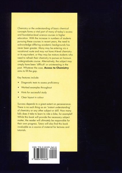 Chemistry or the understanding of basic chemical concepts forms a vital part of many of today's access and foundation-level science courses in higher education. With the increase in numbers of students pursuing these courses in recent years, the need to acknowledge differing academic backgrounds has never been greater. Many may be entering via a vocational route and may not have A-level chemistry or its equivalent, or they may be mature students who need to refresh their chemistry to pursue an honours undergraduate course. Alternatively, the subject may simply have been 'difficult' or uninteresting in the past. Whatever the case, Access to Chemistry aims to fill the gap. Key features include: - Diagnostic tests to assess proficiency; - Worked examples throughout; - Hints for successful study; - Clear layout in colour. Success depends to a great extent on perseverance. There is no such thing as an 'instant understanding' of chemistry or any other subject or skill. How many falls does it take to learn to ride a bike, for example? Whilst this book will provide the necessary subject matter, the reader will ultimately be responsible for their own progress. Tutors will also find this book invaluable as a source of material for lectures and tutorials.
