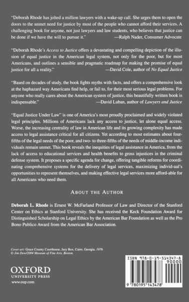 Written by America's leading expert on legal ethics, Access to Justice vividly chronicles the wide gap between the lofty aspirations and harsh realities of American justice. As Deborah L. Rhode demonstrates, America is overlawyered and underrepresented: there is too much law for those who can afford it and too little for everyone else. Although indigent defendants are entitled to legal representation, what satisfies that standard is an affront to the civilized world, and