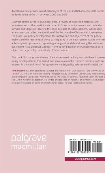 This book addresses an experiment in funding money damage claims in England from 2000 to 2013. The model - recoverable conditional fees - was unique and has remained so. It covers the development, amendment and effective abolition of the model, as well as the process of policy development and the motivation and objectives of the policy makers.