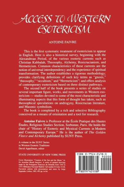 This is the first systematic treatment of esotericism to appear in English. Here is also a historical survey, beginning with the Alexandrean Period, of the various esoteric currents such as Christian Kabbalah, Theosophy, Alchemy, Rosicrucianism, and Hermeticism. Common characteristics of these currents are the notion of universal interdependency and the experience of spiritual transformation. The author establishes a rigorous methodology; provides clarifying definitions of such key terms as "gnosis," "theosophy," "occultism," and "Hermeticism;" and offers analysis of contemporary esotericism based on three distinct pathways. The second half of the book presents a series of studies on several important figures, works, and movements in Western esotericism-studies devoted to some of the most characteristic and illuminating aspects that this form of thought has taken, such as theosophical speculations on androgyny, rosicrucian literature, and Masonic symbolism. The book is completed by a rich and selective Bibliography conceived as a means of orientation and a tool for research.