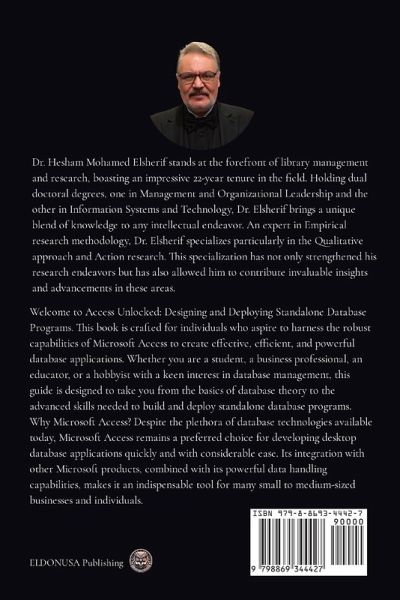 Welcome to Access Unlocked: Designing and Deploying Standalone Database Programs. This book is crafted for individuals who aspire to harness the robust capabilities of Microsoft Access to create effective, efficient, and powerful database applications. Whether you are a student, a business professional, an educator, or a hobbyist with a keen interest in database management, this guide is designed to take you from the basics of database theory to the advanced skills needed to build and deploy standalone database programs. Why Microsoft Access? Despite the plethora of database technologies available today, Microsoft Access remains a preferred choice for developing desktop database applications quickly and with considerable ease. Its integration with other Microsoft products, combined with its powerful data handling capabilities, makes it an indispensable tool for many small to medium-sized businesses and individuals. This book begins by introducing you to the fundamental concepts of databases. You will learn not just how to use Microsoft Access, but why and when to use it. Our journey will start with the basics of creating tables, queries, forms, and reports-each a crucial component in any database system. As we advance, you will discover the power of automation in Access through Macros and the versatility offered by Visual Basic for Applications (VBA). These tools not only streamline operations but also open up a world of customization and enhanced functionality. One of the unique aspects of this book is its focus on turning an Access database into a standalone executable. This is a critical skill for anyone looking to distribute their software professionally. We cover the entire process from the initial design and development stages to the final steps of compiling, packaging, and deploying the application as a fully functional, independent software product. We believe in learning by doing, which is why Access Unlocked is packed with step-by-step tutorials, practical examples, and real-world case studies. These elements are aimed at providing a hands-on experience, enhancing your learning, and giving you the confidence to apply your knowledge to real-world scenarios. Lastly, no book on software is complete without addressing maintenance and troubleshooting. Maintaining an application is as crucial as building it. Thus, we provide you with strategies to update, troubleshoot, and refine your database applications post-deployment. We are excited to guide you through this comprehensive journey into the world of Microsoft Access. By the end of this book, you will not only be adept at using Access to its full potential but also be capable of creating an independent database application ready for real-world deployment. Enjoy your journey with Access, and may this book unlock the door to many successful database projects. Happy learning! Dr. Hesham Mohamed Elsherif