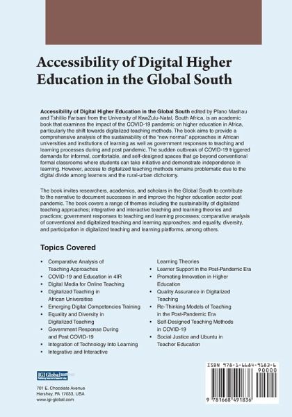 Accessibility of Digital Higher Education in the Global South , authored by Pfano Mashau and Tshililo Farisani from the University of KwaZulu-Natal, South Africa, is an academic book that examines the impact of the COVID-19 pandemic on higher education in Africa. The book aims to provide a comprehensive analysis of the sustainability of the "new normal" approaches in African universities and institutions of learning as well as government responses to teaching and learning processes during and post pandemic. The sudden outbreak of COVID-19 triggered demands for informal, comfortable, and self-designed spaces that go beyond conventional formal classrooms where students can take initiative and demonstrate independence in learning. However, access to digitalized teaching methods remains problematic due to the digital divide among learners and the rural-urban dichotomy. The book invites researchers, academics, and scholars in the Global South to contribute to the narrative to document successes in and improve the higher education sector post pandemic. The book covers a range of themes including the sustainability of digitalized teaching approaches; integrative and interactive teaching and learning theories and practices; government responses to teaching and learning processes; comparative analysis of conventional and digitalized teaching and learning approaches; and equality, diversity, and participation in digitalized teaching and learning platforms, among others.