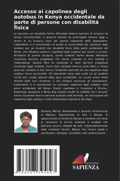 Le persone con disabilità hanno affrontato diverse barriere di accesso da tempo immemorabile. Il governo keniota ha promulgato diverse leggi a favore di un accesso equo per questo segmento della popolazione. L'attenzione si è concentrata sul grado di accessibilità dei capolinea degli autobus per gli studenti con disabilità fisica della parte occidentale del Kenya, che utilizzano spesso i capolinea degli autobus per recarsi a scuola. All'interno di queste strutture, questi studenti hanno dovuto affrontare numerose barriere progettuali che hanno impedito la loro mobilità e indipendenza. Questo libro ha esplorato le varie barriere progettuali incontrate dagli studenti. Sono state utilizzate diverse scale likert a cinque punti per valutare in che misura l'ambiente costruito nei vari capolinea degli autobus fosse accessibile. Gli intervistati sono stati scelti tra gli studenti iscritti alle scuole speciali della zona occidentale. Le scuole erano molto distanti dalle loro residenze, il che rendeva necessari gli spostamenti. L'attenzione si è concentrata sui principali capolinea degli autobus nella parte occidentale del Kenya. Questi capolinea si trovavano a Kisumu, Kakamega, Bungoma e Kendu Bay. Questo studio ha stabilito che i discenti hanno incontrato diverse barriere presenti nelle fermate, nei marciapiedi dei capolinea degli autobus e nella disposizione impropria dei bagni.