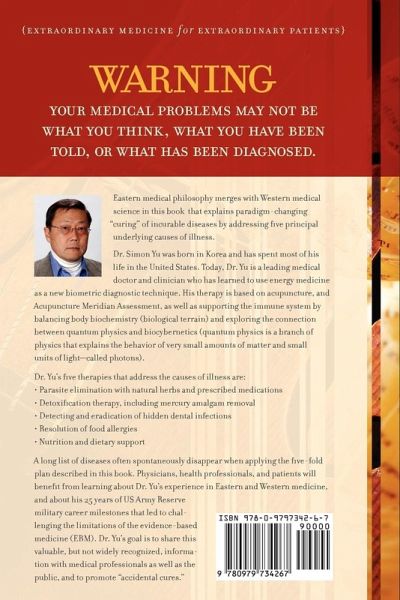 Twenty five years ago, Dr. Simon Yu, a board-certified medical doctor specializing in internal medicine, found himself working at an HMO prescribing drugs that masked the symptoms of disease, but did not cure disease. He had reached a turning point in his career and decided to research what is known as integrative medicine - a path that combines natural therapies with conventional methods. Integrative medicine seeks to achieve healing with therapies that stimulate the body's own mechanisms of rebuilding and repair. This book contains a detailed account of his discoveries in the United States and Europe, and how he learned to diagnose and treat underlying causes of chronic diseases. Dr. Yu identifies and addresses five main causes of chronic illnesses which are commonly overlooked: heavy metals, food allergies and sensitivities, dental problems, diet and nutrition, and parasites and fungal problems. WARNING: Your medical problems may not be what you think or what you have been told. Accidental Cure refers to a discovery that Dr. Simon Yu made in Bolivia during a U.S. Army Reserves assignment in 2000. The Army was there to dispense anti-parasite drugs to 10,000 Bolivians. In the few weeks that Dr. Yu worked with patients in Bolivia, he noticed remarkable changes in patient health and decided to try the drugs in his practice when he returned to St. Louis. Dr. Yu has startling results by treating the multiple overlooked and synergistic causes of chronic illness, which vary by the individual. Root causes include parasites, fungi/mold, and a range of dental problems, from mercury toxicity and root canals to cavitations, in addition to food allergies and sensitivities, and environmental toxins. There are many case studies in his book that describe "incurable" and other chronic diseases that disappear when these ongoing challenges to the immune system are systematically identified and addressed. This book explains Dr. Yu's innovative technique of Acupuncture Meridian Assessment as part of a comprehensive medical evaluation, and includes many resources for patients.