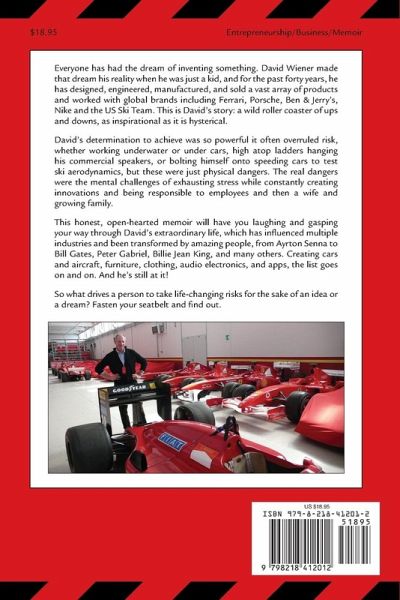 Everyone has had the dream of inventing something. David Wiener made that dream his reality when he was just a kid, and for the past forty years, he has designed, engineered, manufactured, and sold a vast array of products and worked with global brands including Ferrari, Porsche, Ben & Jerry's, Nike and the US Ski Team. This is David's story: a wild roller coaster of ups and downs, as inspirational as it is hysterical. David's determination to achieve was so powerful it often overruled risk, whether working underwater or under cars, high atop ladders hanging his commercial speakers, or bolting himself onto speeding cars to test ski aerodynamics, but these were just physical dangers. The real dangers were the mental challenges of exhausting stress while constantly creating innovations and being responsible to employees and then a wife and growing family. This honest, open-hearted memoir will have you laughing and gasping your way through David's extraordinary life, which has influenced multiple industries and been transformed by amazing people, from Ayrton Senna to Bill Gates, Peter Gabriel, and many others. Creating cars and aircraft, furniture, clothing, audio systems and apps, the list goes on and on. And he's still at it! So what drives a person to take life-changing risks for the sake of an idea or a dream? Fasten your seatbelt and find out.