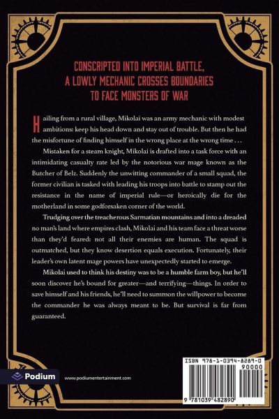 Conscripted into imperial battle, a lowly mechanic crosses boundaries to face monsters of war, in this thrilling dark-fantasy adventure. Hailing from a rural village, Mikolai was an army mechanic with modest ambitions: keep his head down and stay out of trouble. But then he had the misfortune of finding himself in the wrong place at the wrong time . . . Mistaken for a steam knight, Mikolai is drafted into a task force with an intimidating casualty rate led by the notorious war mage known as the Butcher of Belz. Suddenly the unwitting commander of a small squad, the former civilian is tasked with leading his troops into battle to stamp out the resistance in the name of imperial rule-or heroically die for the motherland in some godforsaken corner of the world. Trudging over the treacherous Sarmatian mountains and into a dreaded no man's land where empires clash, Mikolai and his team face a threat worse than they'd feared: not all their enemies are human. The squad is outmatched, but they know desertion equals execution. Fortunately, their leader's own latent mage powers have unexpectedly started to emerge. Mikolai used to think his destiny was to be a humble farm boy, but he'll soon discover he's bound for greater-and terrifying-things. In order to save himself and his friends, he'll need to summon the willpower to become the commander he was always meant to be. But survival is far from guaranteed. The first volume of the hit progression fantasy series-with more than a million views on Royal Road-now available in paperback, ebook, and audiobook!