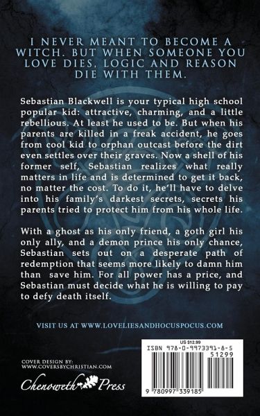 "I never meant to become a witch. But when someone you love dies, logic and reason die with them." Sebastian Blackwell is your typical high school popular kid: attractive, charming, and a little rebellious. At least he used to be. But when his parents are killed in a freak accident, he goes from cool kid to orphan outcast before the dirt even settles over their graves. Now a shell of his former self, Sebastian realizes what really matters in life and is determined to get it back, no matter the cost. To do it, he'll have to delve into his family's darkest secrets, secrets his parents tried to protect him from his whole life. With a ghost as his only friend, a goth girl his only ally, and a demon prince his only chance, Sebastian sets out on a desperate path of redemption that seems more likely to damn him than to save him. For all power has a price, and Sebastian must decide what he is willing to pay to defy death itself.