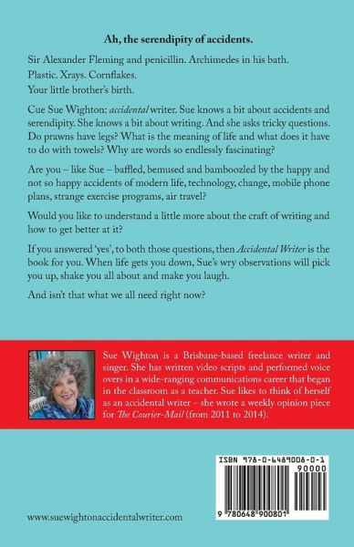 Ah, the serendipity of accidents. Sir Alexander Fleming and penicillin. Archimedes in his bath. Plastic. Xrays. Cornflakes. Your little brother's birth. Cue Sue Wighton: accidental writer. Sue knows a bit about accidents and serendipity. She knows a bit about writing. And she asks tricky questions. Do prawns have legs? What is the meaning of life and what does it have to do with towels? Why are words so endlessly fascinating? Are you - like Sue - baffled, bemused and bamboozled by the happy and not so happy accidents of modern life, technology, change, mobile phone plans, strange exercise programs, air travel? Would you like to understand a little more about the craft of writing and how to get better at it? If you answered 'yes', to both those questions, then Accidental Writer is the book for you. When life gets you down, Sue's wry observations will pick you up, shake you all about and make you laugh. And isn't that what we all need right now?