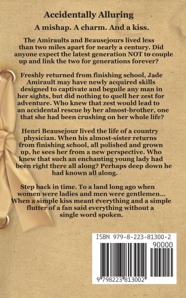 A mishap. A charm. And a kiss. The Amiraults and Beausejours lived less than two miles apart for nearly a century. Did anyone expect the latest generation NOT to couple up and link the two for generations forever? Freshly returned from finishing school, Jade Amirault may have newly acquired skills designed to captivate and beguile any man in her sights, but did nothing to quell her zest for adventure. Who knew that zest would lead to an accidental rescue by her almost-brother, one that she had been crushing on her whole life? Henri Beausejour lived the life of a country physician. When his almost-sister returns from finishing school, all polished and grown up, he sees her from a new perspective. Who knew that such an enchanting young lady had been right there all along? Perhaps deep down he had known all along. Step back in time. To a land long ago when women were ladies and men were gentlemen… When a simple kiss meant everything and a simple flutter of a fan said everything without a single word spoken. A heartwarming historical romance set in the early 1850's with happily ever after.