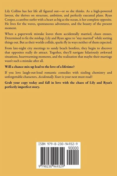 Lily Collins has her life all figured out-or so she thinks. As a high-powered lawyer, she thrives on structure, ambition, and perfectly executed plans. Ryan Cooper, a carefree surfer with a heart as big as the ocean, is her complete opposite. He lives for the waves, spontaneous adventures, and the beauty of the present moment. When a paperwork mistake leaves them accidentally married, chaos ensues. Determined to fix the mishap, Lily and Ryan agree to "stay married" while sorting things out. But as their worlds collide, sparks fly in ways neither of them expected. From late-night city meetings to sandy beach bonfires, they begin to discover that opposites really do attract. Together, they'll navigate hilariously awkward situations, heartwarming moments, and the realization that maybe their marriage wasn't such a mistake after all. Will a chance mix-up lead to the love of a lifetime? If you love laugh-out-loud romantic comedies with sizzling chemistry and unforgettable characters, Accidentally Yours is your next must-read! Grab your copy today and fall in love with the chaos of Lily and Ryan's perfectly imperfect story.