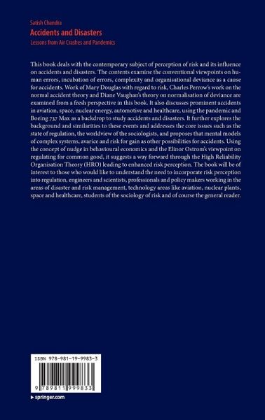 This book deals with the contemporary subject of perception of risk and its influence on accidents and disasters. The contents examine the conventional viewpoints on human errors, incubation of errors, complexity and organisational deviance as a cause for accidents. Work of Mary Douglas with regard to risk, Charles Perrow's work on the normal accident theory and Diane Vaughan's theory on normalisation of deviance are examined from a fresh perspective in this book. It also discusses prominent accidents in aviation, space, nuclear energy, automotive and healthcare, using the pandemic and Boeing 737 Max as a backdrop to study accidents and disasters. It further explores the background and similarities to these events and addresses the core issues such as the state of regulation, the worldview of the sociologists, and proposes that mental models of complex systems, avarice and risk for gain as other possibilities for accidents. Using the concept of nudge in behavioural economics and the Elinor Ostrom's viewpoint on regulating for common good, it suggests a way forward through the High Reliability Organisation Theory (HRO) leading to enhanced risk perception. The book will be of interest to those who would like to understand the need to incorporate risk perception into regulation, engineers and scientists, professionals and policy makers working in the areas of disaster and risk management, technology areas like aviation, nuclear plants, space and healthcare, students of the sociology of risk and of course the general reader.
