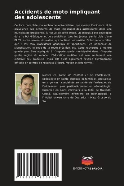 Ce livre consolide ma recherche universitaire, qui montre l'incidence et la prévalence des accidents de moto impliquant des adolescents dans une municipalité brésilienne. À l'issue de cette étude, un produit a été développé dans le but d'éduquer et de sensibiliser tous les jeunes par le biais d'une BLITZ exclusivement éducative, qui contient une variété d'informations telles que : les taux d'accidents généraux et spécifiques, les panneaux de signalisation, le code de la route brésilien, etc. Cette recherche a montré qu'elle peut être appliquée à n'importe quelle municipalité dans n'importe quelle région du monde. L'éducation routière est non seulement une initiative peu coûteuse, mais elle s'est également révélée extrêmement efficace en termes de résultats à court, moyen et long terme.
