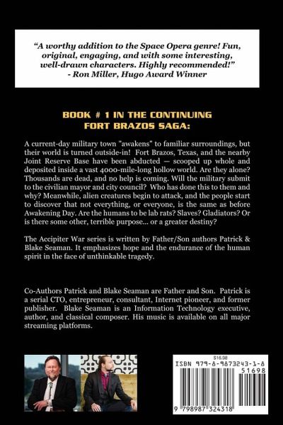 The current-day military town of Fort Brazos, Texas, awakens to strange surroundings in a vast, outside-in hollow world. A city in a bottle. Thousands are dead. Thrown into crisis, they are alone, with no help coming. Where are they? Will the military submit to the civilian mayor and city council? Who has done this to them and why? Meanwhile, alien creatures begin to attack, and the people start to discover that not everything, or everyone, is the same as they were before Awakening Day. Are the humans to be lab rats? Slaves? Or is there some other terrible purpose... or a greater destiny? Set in the near future, Accipiter War is the first in a series of five books in the Fort Brazos Saga by Father/Son authors Patrick & Blake Seaman. It emphasizes hope and the endurance of the human spirit in the face of unthinkable tragedy.