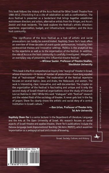 Explores the history of Acco Festival for Other Israeli Theatre from 1980-2012 as a site of celebration and confrontation. Acco Festival is a borderland bringing together established directors from the center of the field with alternative artists outside of it, as well as bringing together the center's hegemony and Acco's Jewish and Arab residents.